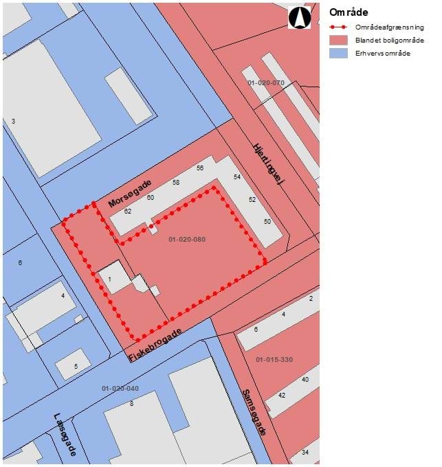 Området afgrænses af Fiskebrogade mod syd og Morsøgade mod vest. Mod nord og øst følger lokalplanafgrænsningen ikke vej- eller stiforbindelser, men følger den forventede matrikelopdeling mellem eksisterende og ny boligbebyggelse.
