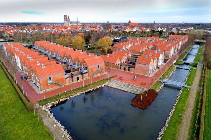 Billedet viser feriecenterets regnvandsbassin til overfladevand. Regnvandsbassinet er udformet som en smuk kanal langs teglstensbebyggelsen, og udgør ca. 3000m2.