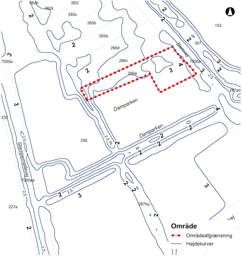 Terrænet i området stiger en smule fra vest mod øst og ligger cirka i kote 3 m – kote 3,75 m DVR90 hvor ny bebyggelse ønskes opført. I den vestlige ende falder terrænet til kote 1.50 m DVR90 mod Haulund bæk som løber langs boligområdets bagside og gennem feriecenteret. I den østlige ende stiger terrænet til kote 4 m DVR90 mod Damvej.