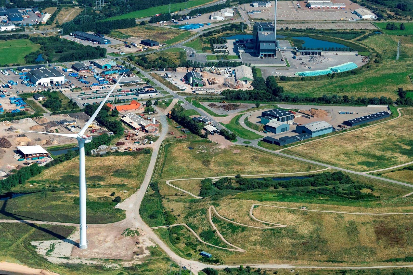 Luftfotoet viser lokalplanområdet, forsøgsmølle og del af Måde Bakker