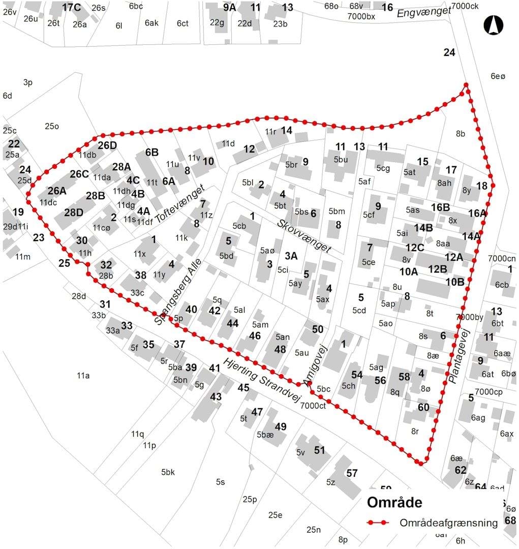 Lokalplanområdet er beliggende i Hjerting og omfatter et areal på 53.340 m2. Området afgrænses mod nord/vest af Hjerting Lystanlæg, mod øst af Plantagevej og mod syd af Hjerting Strandvej. Hjerting Lystanlæg strækker sig mellem Plantagevej og Hjerting Strandvej. Lystanlægget er Hjertings bydelspark og er meget benyttet af områdets beboere.