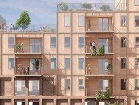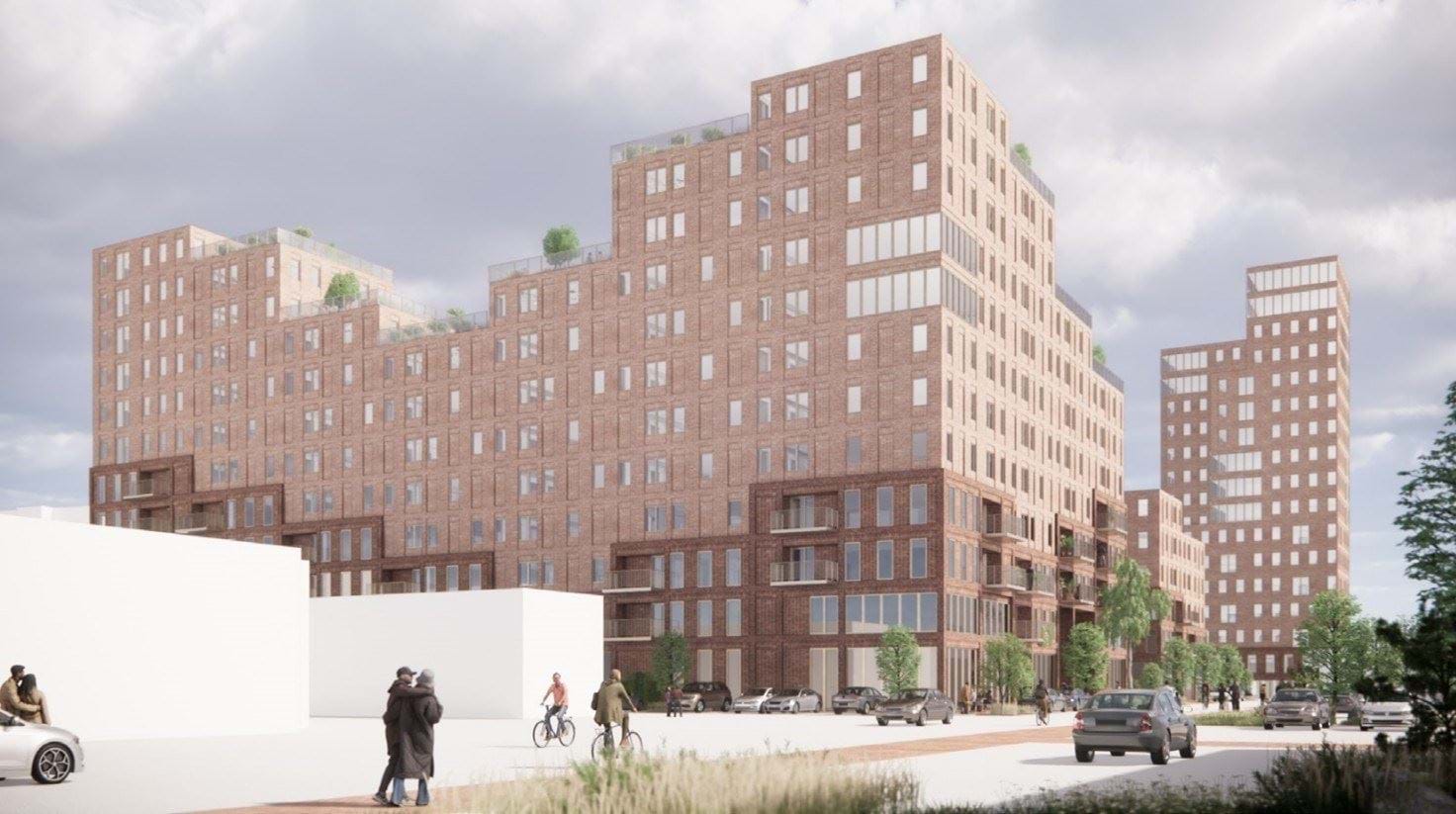 Figur 7 – Eksempel på realisering af lokalplanen set fra Læsøgade mod syd. Her ses op- og nedtrapning af etager samt materialeskift med røde teglsten i basen. I baggrunden ses hotellet.