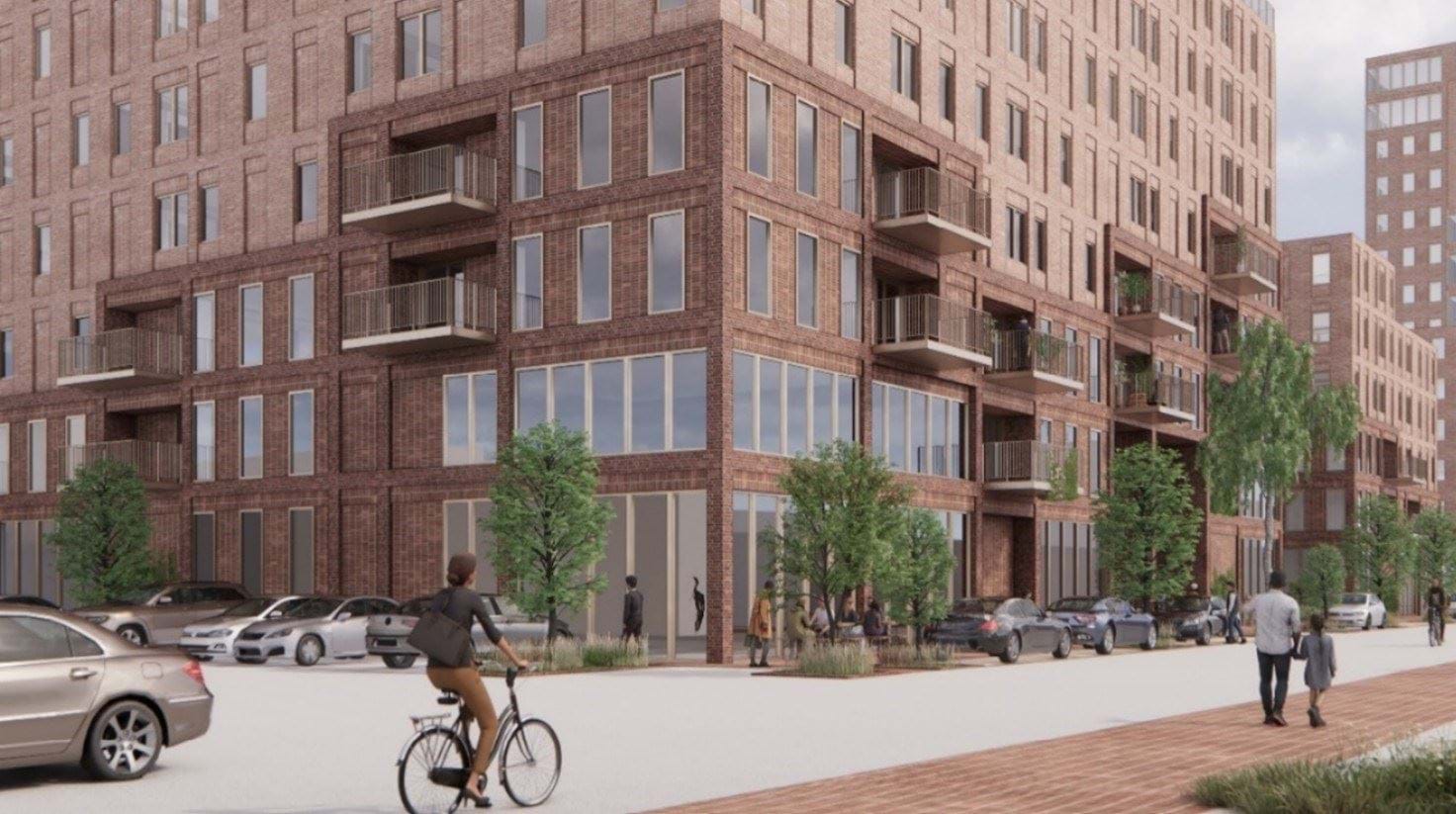 Parkering etableres både på terræn og under terræn. Langs den gennemgående vej nord for bebyggelsen etableres parkering på terræn, mens der etableres parkeringskælder og -dæk under selve bebyggelsen og bebyggelsens gårdrum. Der skal mindst anlægges/udlægges 1 p-plads pr. bolig i etageboligbebyggelse (dog kun ½ p-plads pr. bolig under 80 m²) og 1 p-plads pr. 100 m² etageareal til erhverv eller hotel. Derudover skal der etableres cykelparkering svarende til 2 pladser pr. bolig og 2 pladser pr. 100 m² etageareal til erhverv.
