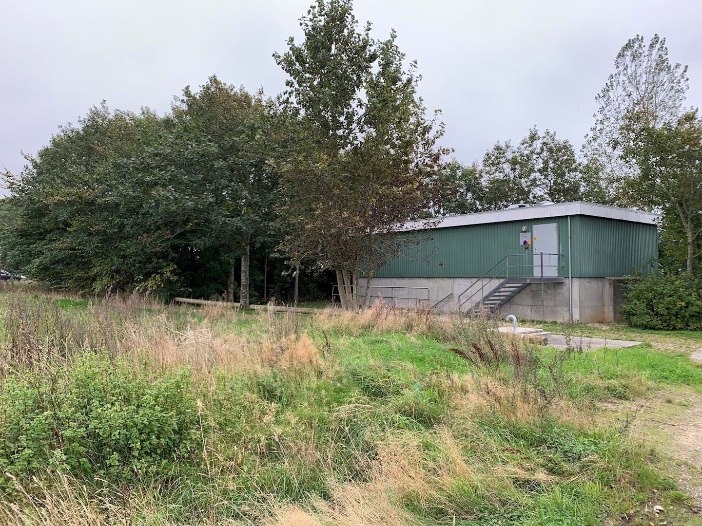 Området syd for lokalplanområdet, med pumpestation og beplantning.
