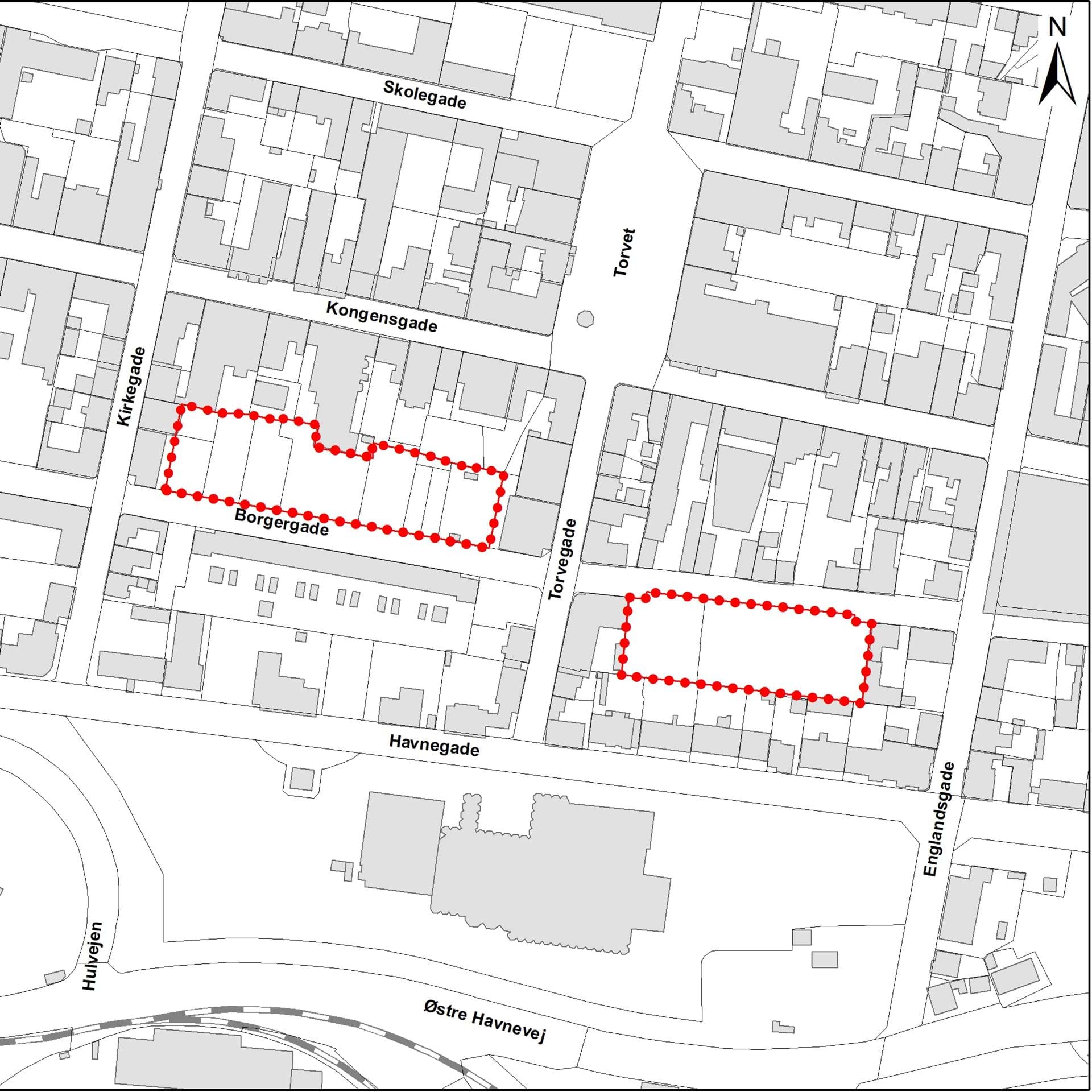 I lokalplanen er der et mindre område, der ligger inden for to karreer i Borgergade. Dette område ligger uden for de udpegede byggefelter. Baggrunden for dette er, at der i det pågældende område er en særlig mulighed for at gennemføre en større og sammenhængende byomdannelse. Forudsætningen for at denne byomdannelse kan gennemføres er, at der foretages særskilt lokalplanlægning. Med det nuværende vidensgrundlag er der ikke forudsætninger for at fastsætte byggeretsgivende bestemmelser for området.