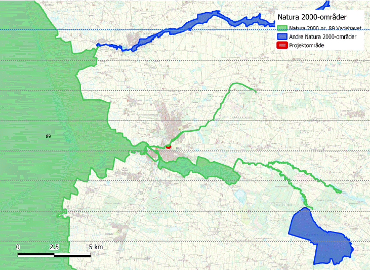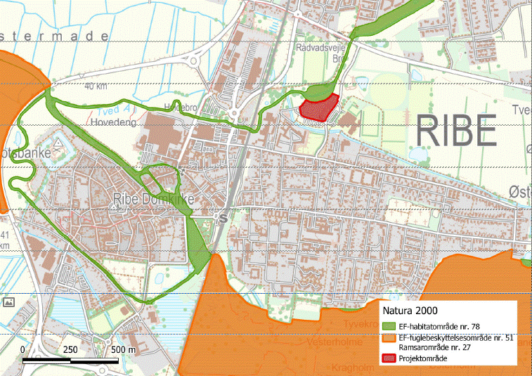 Afstanden fra projektområdet til de nærmeste dele af fuglebeskyttelsesområde er nr. 51 Ribe Holme og enge med Kongeåens udløb, er hhv. ca. 870 meter til et areal mod syd og ca. 1250 meter til et areal mod vest. På grund af afstanden fra projektområdet til fuglebeskyttelsesområdet vurderes projektet ikke, at kunne medføre påvirkninger af fugle på udpegningsgrundlaget, der opholder sig inden for fuglebeskyttelsesområdet eller ramsarområdet.