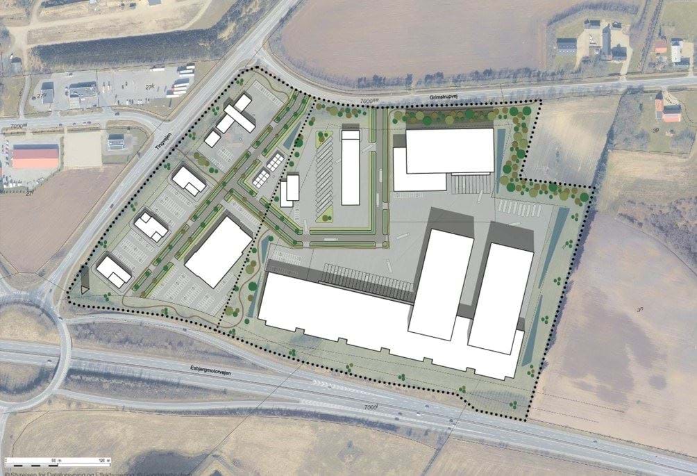 Hvis man benytter den østligste overkørsel fra Grimstrupvej kører man direkte ind i erhvervsdelen i delområde II, hvor det primært er den tunge trafik, som skal benytte vejen. Denne ind- og udkørsel benyttes udelukkende af tunge køretøjer, hvor det skal sikres at lastbiler op til 25 meter kan køre til delområde II. Fra delområde II kan man ligeledes køre til delområde I hvor vejforbindelsen forbinder punkterne C og D i henhold til kortbilag B.