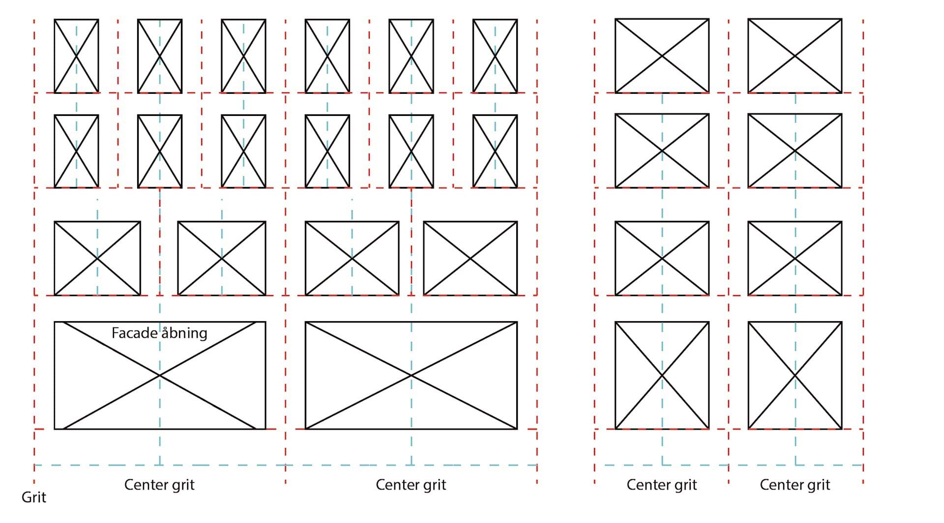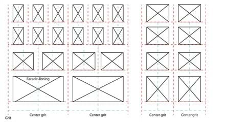 Alle facadeåbninger som vinduer, døre og altaner skal placeres centralt i grid-systemet.