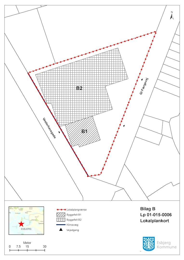 Lokalplanen giver mulighed for bebyggelse indenfor to fastsatte og forskellige byggefelter. I byggefelt B1 må byggeri opføres med en samlet højde på op til 10 m. I byggefelt B2 gives der mulighed for en bygningshøjde på 12m. Bebyggelsen skal placeres tilbagetrukket fra Gl. Færgevej og delvist fra Vesterhavsgade, og må kun opføres indenfor de udlagte byggefelter B1 og B2.