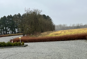 Derudover består beplantningen hovedsageligt af åbne grønne græsområder med enkelte træer, buske og blomsterbede.
