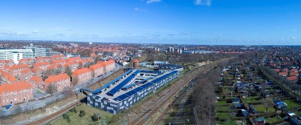 Luftfoto af det eksisterende parkeringshus og området.